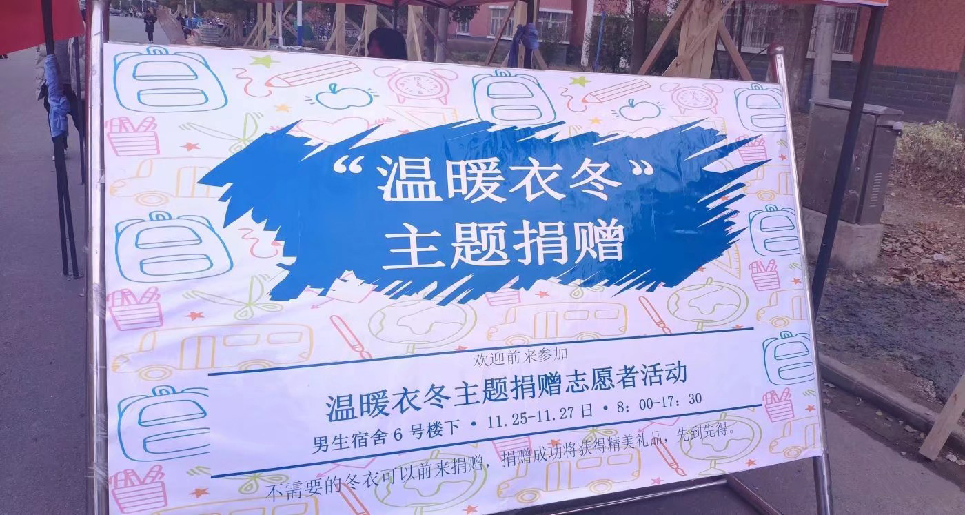 为了响应滁州市天使协会关于开展“送温暖献爱心”捐赠活动的号召,组织以“温暖衣冬”为主题的捐赠活动,实现闲置资源的合理化配置与循环使用,给贫困地区儿童寒冬里送去一份温暖,传媒学院团总支联合食环学院于11月26日至11月27日举办“温暖衣冬”捐赠冬衣活动。