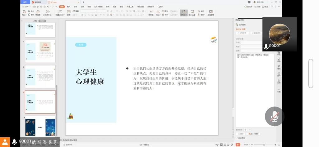为进一步提高我院大学生的心理素质,促进学生们的身心健康和谐,宣传普及心理健康知识,深入开展心理健康教育。5月27日,传媒与设计学院学生会在腾讯会议召开以“宅家新生活”为主题的心理健康线上会议,会议内容主要涉及“爱生活,爱自己,爱同学,爱校园,爱家人,爱朋友”等方面。会议由学生会副主席钱思思主持,学生会大一、大二干事参与线上会议。