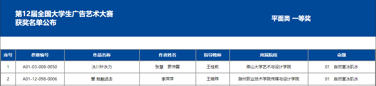 全国大学生广告艺术大赛(大广赛)是由教育部高等教育司指导,教育部高等学校新闻传播学类专业教学指导委员会、中国高等教育学会广告教育专业委员会共同主办,中国传媒大学、全国大学生广告艺术大赛组委会承办的全国高校A类竞赛。此次竞赛共收到全国1582所本专科院校共计535982组作品,参赛大学生112万人次,最终共30589组作品入围全国总评审,其中平面类作品安徽省仅四件获一等奖,这也是大广赛自开赛以来安徽省高职院校第二次获此奖项。