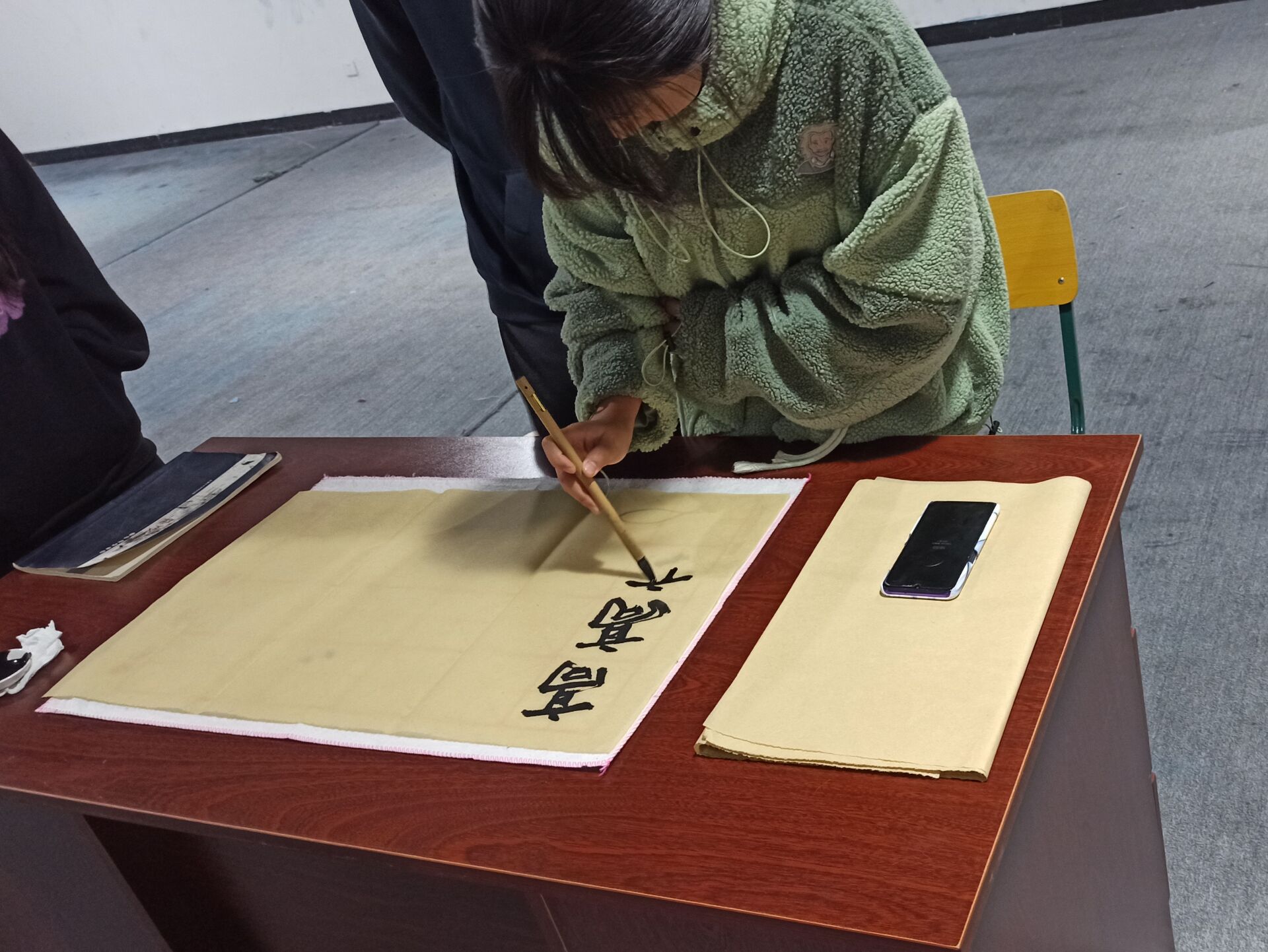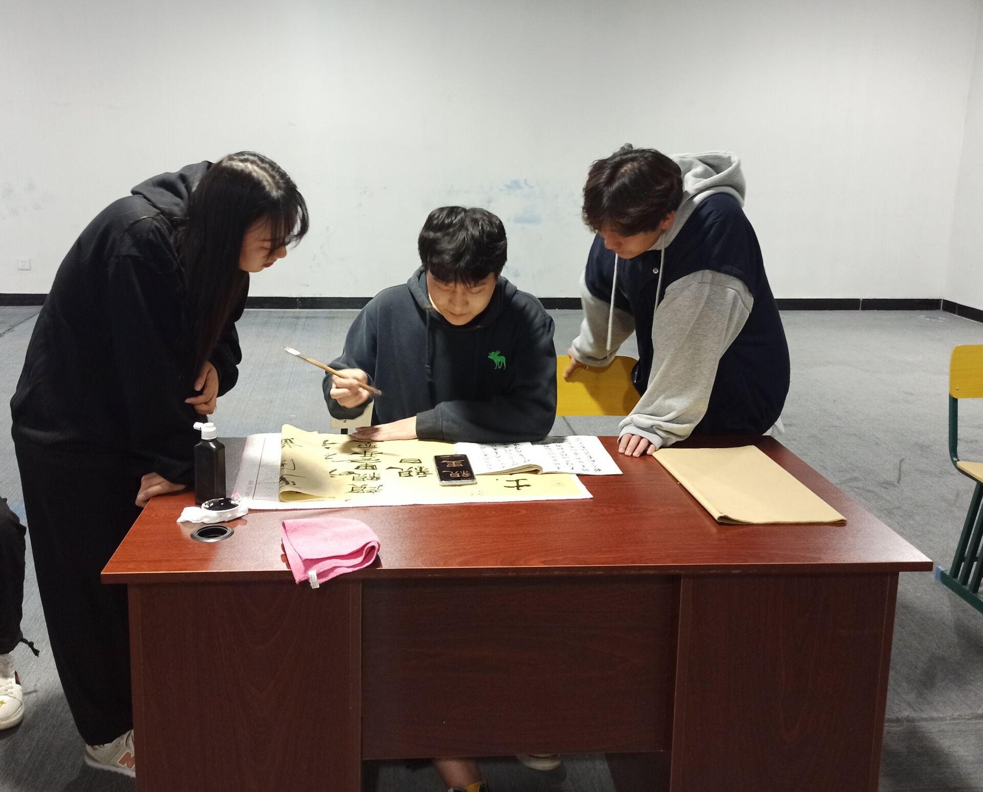 整个活动社都弥漫着墨香,后来又有来自书法社的社长展示更为潇洒,气势恢宏的书法作品。看到大家对书法如此热爱,书法社社长更是开始了现场教学,一个个法度谨严,规中见逸的大楷从他的笔下诞生。