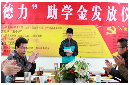 学生代表檀震做了发言,首先感谢安徽德力日用玻璃股份有限公司的慷慨资助,并感谢学院的精心培育,表示一定以优异的成绩回报学校和社会的关爱,不辜负大家的期望。