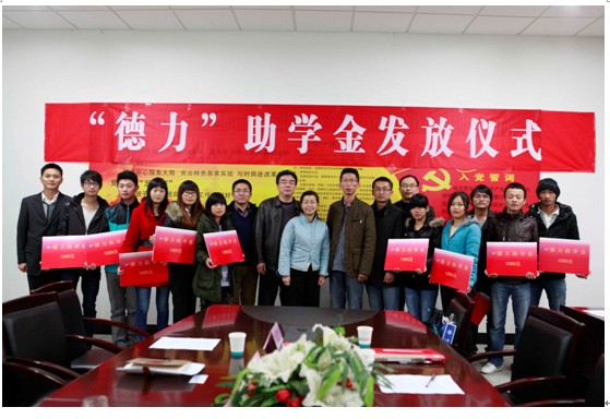 2012年11月21号下午三点半,艺术设计系主办Beat365唯一官方网站2012“德力”助学金发放仪式。院纪委书记牛春雨,安徽德力日用玻璃股份有限公司副总经理俞乐,人力资源部部长张智磊,艺术设计系书记陈震,系副主任闻建强、杨之武,德力产品研发中心负责人蔡忠弟及全体获助学生参加发放仪式。仪式由陈震书记主持,杨之武副主任宣读获助学生名单。