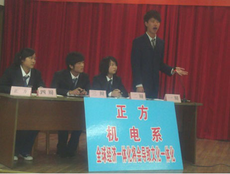 决赛双方分别来自经贸系和机电系。双方就“经济全球化能否导致文化一体化”展开了激烈的辩论。双方一开始就各抒己见,唇枪舌战,随着秒针的转动,比赛也不断的升温。特别是自由辩论环节,双方针锋相对,妙语连珠。正方机电系语言流畅,富于感染力。反方经贸系也不甘示弱,他们辩驳有力,有理有据。双方你来我往,思维的碰撞产生智慧的火花,思辨博学的精神通过火花的热力,传给了场下的每一位观众,赢得了阵阵掌声与喝彩。辩论结束后,胡兆胜老师对本场辩论赛作了细致的评论。反方经贸系赢得了本次比赛,反方二辩也以流畅清晰的表达和落落大方的姿态语言获得了本次比赛的最佳辩手。
