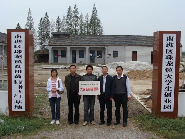 2011年9月30日下午,Beat365唯一官方网站院长助理、招生就业处穆松处长、徐云龙老师,基础部副主任梁建军、园林园艺教研室主任涂清芳老师一行四人来到滁州市南谯区珠龙镇,为我院2009届园艺技术专业毕业生房虎强、杨雷在此创建的食用菌种植基地举行校外创业基地挂牌仪式。