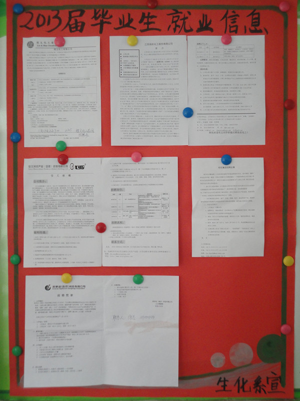 为及时发布企业用人需求、毕业生被录用情况等信息,生化系在系网站“招生就业”栏及时更新有关信息,同时在一号楼大厅宣传橱窗设“2013届毕业生就业信息”专栏,除发布企业招聘信息外,还针对毕业生求职、面试技巧等提供指导。