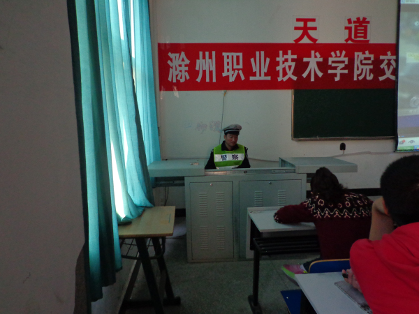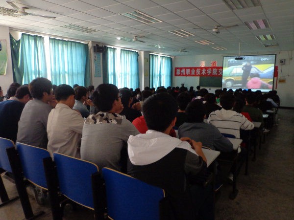 在同学们热烈的掌声中,滁州市交警支队的郑警官向汽车系的同学们展开了精彩的讲说。首先,他就交通安全知识方面作出了重要解说,并以如何加强交通安全这一问题作为论点,加强同学们的自我保护能力。随后,郑警官为同学们播放了一段交通事故的视频,让同学们更加深刻的了解到了交通安全的重要性。