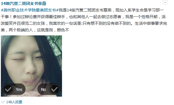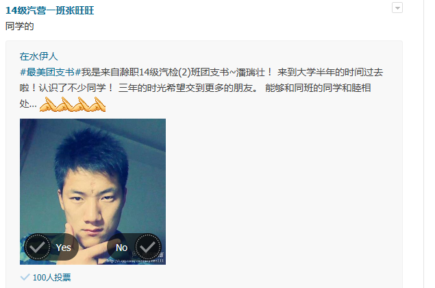 最美团支书不仅仅是美在外表、美在气质、更重要的是美在心灵、美在行为。汽车系各班团支书通过微博上传了照片、个人简介、工作成果以及未来展望等,向同学们展现了自己的风采。青春在于奉献,美丽在于平凡。在同学的投票下,最终由14级汽营(2)班章燕同学获得了“最美”团支书的称号。