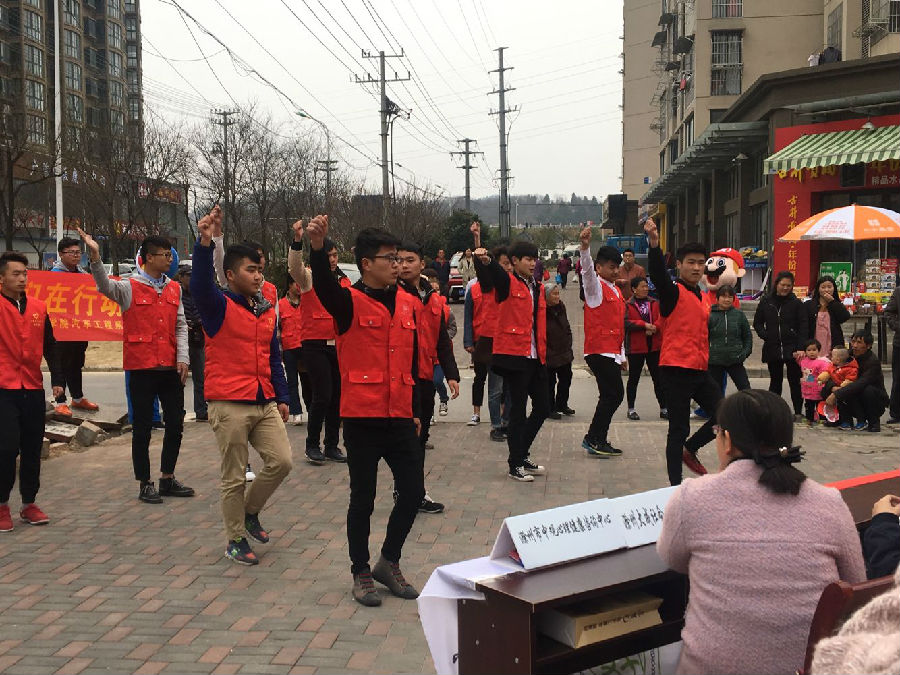 由院团委联合琅琊团区委开展“强化专业应用,造福滁州市民”雷锋月系列活动3月5日在凤凰湖社区正式开始。汽车系30名青年志愿者积极参加,用“快闪”方式宣传雷锋精神。