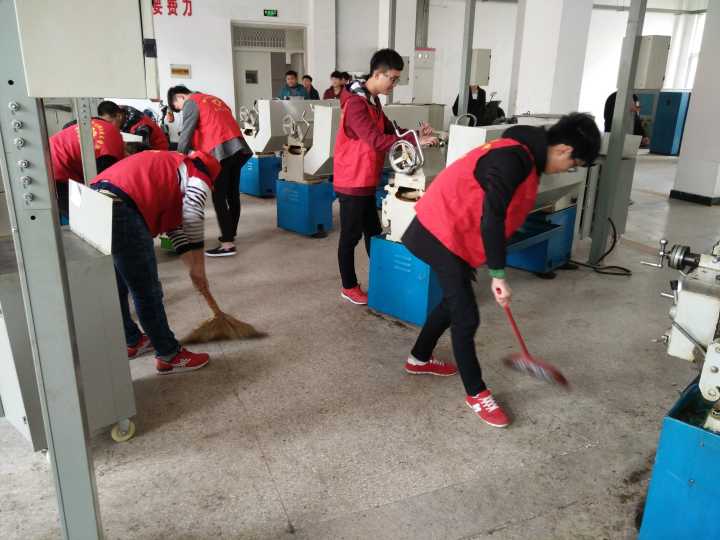 同学们在实训楼车间分工行动,各尽其职。有的扫地,有的拖地,有的擦车床。虽然有些辛苦,但是同学们没有怕脏,也没有喊累。那一刻,他们感受到团结的力量,充分体现了班级内成员的友谊和团结合作精神。在同学们的辛勤劳动下,实训楼车间很快就被清扫干净。