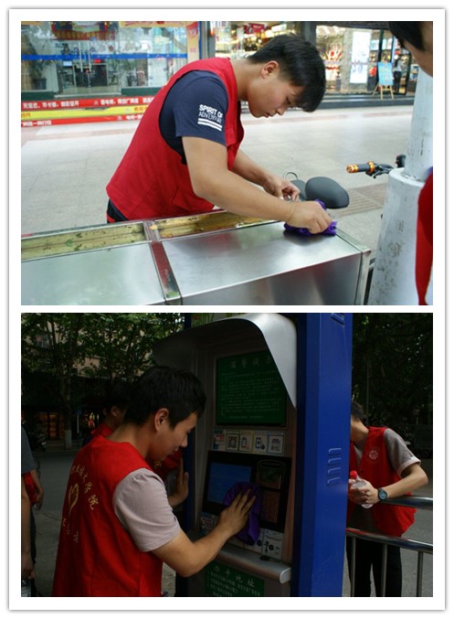 活动过程中志愿者们在街头清理小广告,清洗公共自行车,打扫垃圾等多项便民服务公益活动,深受社区居民和街头过往群众的欢迎。