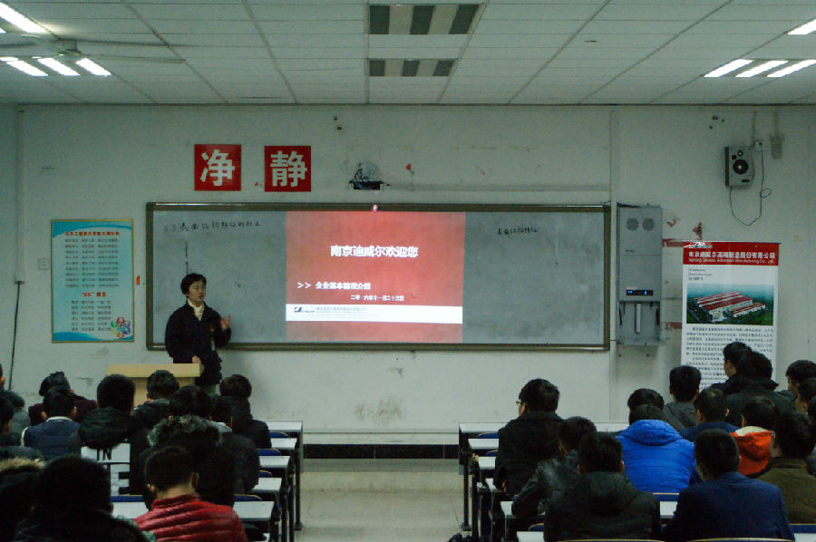 招聘简介由资源部经理游晓红主持,她主要向我们介绍了公司简介,南京迪威尔公司是一家专业研发、生产和销售油气设备专用件的高新技术企业。且此公司先后被评为“国家火炬计划重点高新技术企业”。在最后向我们介绍了公司的加工流程、加工车间、主要客户及在公司的福利。更说明了将于12月3日在学校招聘人员。