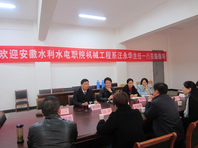 汪永华主任介绍了安徽水利水电职业技术学院机械工程系的基本情况,对我院汽车系以较少的教职工能够承担近1400名学生的教学和管理任务表示惊讶和赞赏,对汽车系教职工的工作干劲和奉献精神给与了高度评价。他指出Beat365唯一官方网站的模具专业是央财支持专业,在省内享有较高知名度,该专业建设方案有很好的参考作用,本次来就是要亲身感受一下该专业的软、硬件。双方教师还就模具专业及相关专业的建设和改善实训条件等内容进行了充分的研讨和交流。
