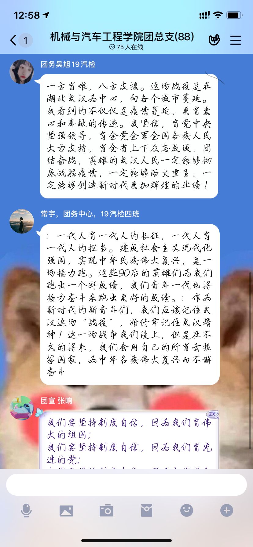 此次主题团课主要以观看视频和ppt讲解为主,同学们在线上主要学习了习近平总书记关于疫情防控工作的系列重要讲话和指示批示精神,其中机汽学院优秀青年志愿者的光荣事迹在团员中产生了极大的热议和共鸣。