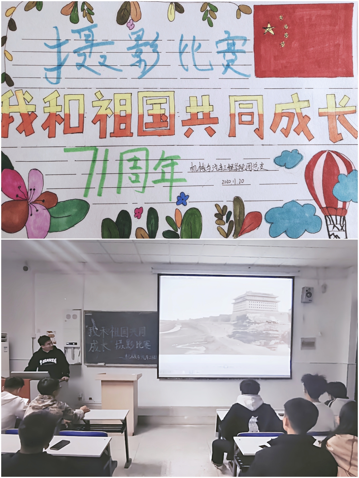 为庆祝中华人民共和国成立71周年,弘扬优秀传统文化。11月20日下午18时许,机械与汽车工程学院团总支在5113教室开展“我和祖国共成长”摄影比赛优秀作品展览活动。此次摄影比赛活动由卢宇航同学主持,并顺利结束。
