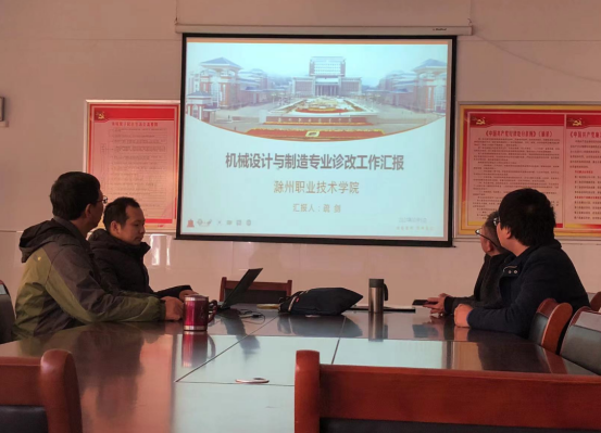 机械设计与制造专业带头人疏剑首先就机械设计与制造专业诊改工作汇报PPT的撰写思路及逻辑结构做了介绍,对专业汇报必须有的内容、可拓展内容进行了说明。随后,廖玉松和谭邦俊两位老师作为课程汇报负责人将各自的ppt进行了汇报演练,现场就ppt相关的细节问题进行了讨论与修正。
