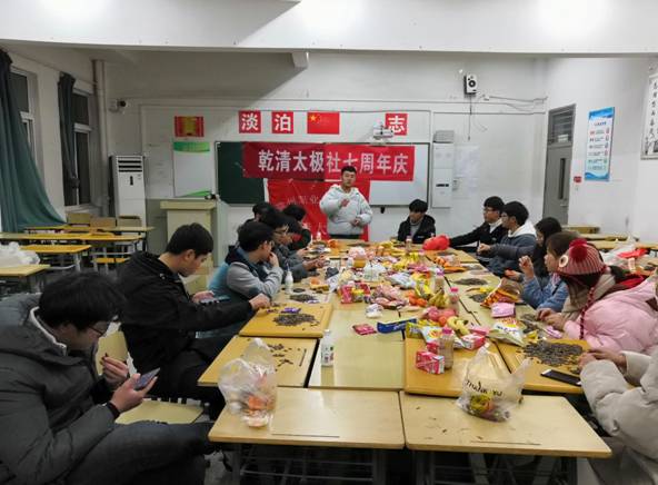 12月27日,乾清太极社在教学楼2502教室举办社团七周年庆,连同轮滑社、武道协会、书法协会、双截棍协会部分骨干共叙发展。