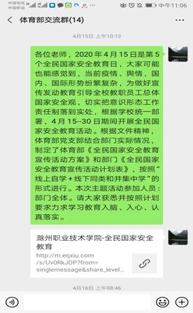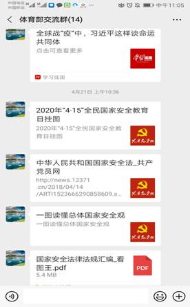 为深入贯彻《教育部办公厅关于组织开展2020年全民国家安全教育日宣传教育活动的通知》(教思政厅函〔2020〕4号)和《安徽省教育厅关于组织开展2020年全民国家安全教育日宣传教育活动的通知》(皖教秘思政〔2020〕20号)的文件要求,落实校党委《关于组织开展2020年全民国家安全教育日宣传教育活动的通知》统一部署,结合Beat365疫情防控和部门工作实际,4月15-30日,体育教学部由党支部牵头组织部门全体教职工采用“线上线下相结合”的方式,灵活运用部门网站、微信群、QQ群、学习强国等媒介,广泛宣传《中华人民共和国国家安全法》、《全国全民安全教育》等国家安全法律法规,营造“国家安全、人人有责”的浓厚氛围,力戒形式主义,坚决防止走形式、走过场,严格保密纪律,严防失密事件发生,切实将校党委通知精神落实到实处。