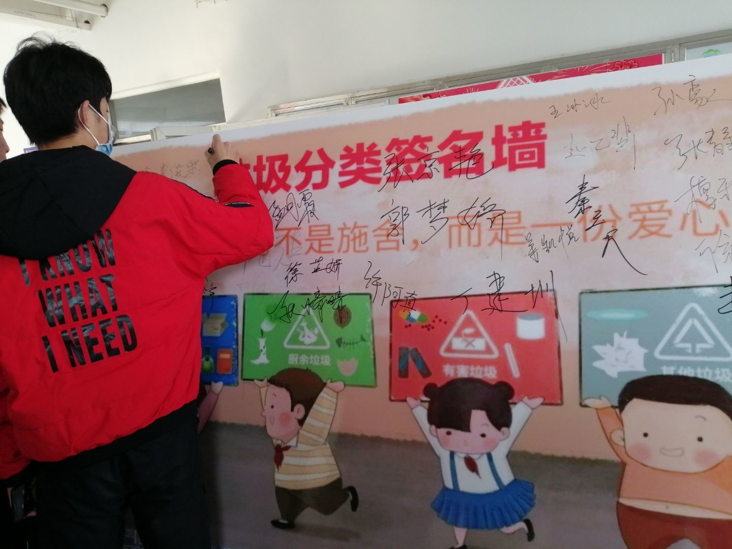 本次活动资政部开展线上宣传,层层落实并建立活动群,在群里通知相关信息,并于12月24日举办了签名墙活动从而使我院学生更加生动具体的学习垃圾分类的相关知识,让我们广泛运动到日常生活中去学以致用,本次活动的举办得到了同学们的积极响应,大家纷纷参与其中,活动现场井然有序进行,资政部干事为签名同学进行拍照记录下这次活动,整个活动在轻松愉快的氛围中圆满落幕了,让垃圾分类的意识深入每一个人的心中。