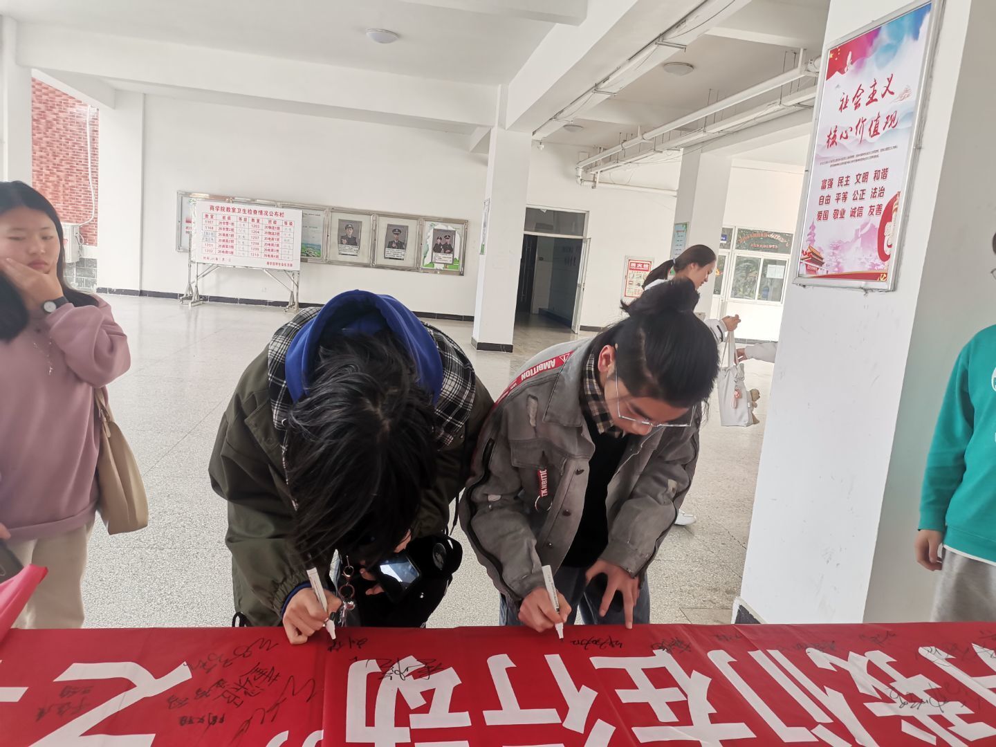活动开始前,大一干事将桌子、横幅、签字笔等活动所需准备完毕。活动开始,同学们来到横幅前,井然有序的在寓意着雷锋志愿者服务精神的横幅上签下了自己的名字,并表示要向雷锋同志学习,把雷锋精神践行到生活中。