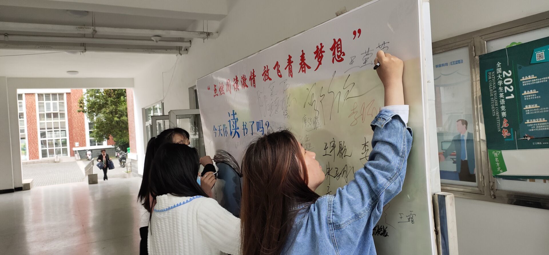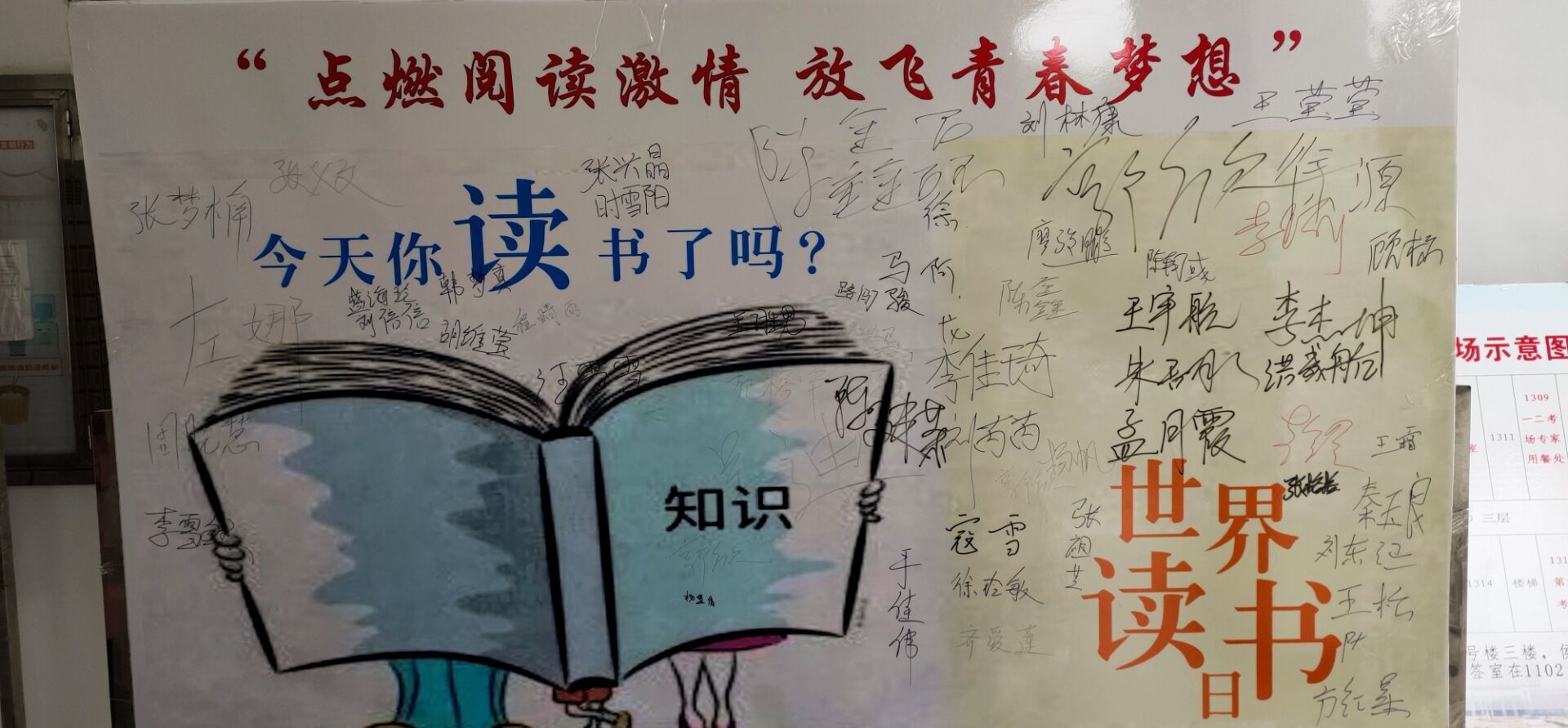 活动现场,工作人员向同学们介绍了本次活动的内容和意义,号召大家趁着青春年华,大好时光,多去图书馆遨游书海、勤于学习、敏于求知,为不负青春而读书,为实现梦想而读书。在“4・23世界读书日”我们通过签名墙的方式来点燃阅读的激情,同时也将用签名的方式来表达青春的梦想。这次活动得到了同学们的积极响应,同时大家在签名墙上签下了自己的名字和读书格言,以此来鞭策自己,表达对读书的热爱和对梦想的期冀。