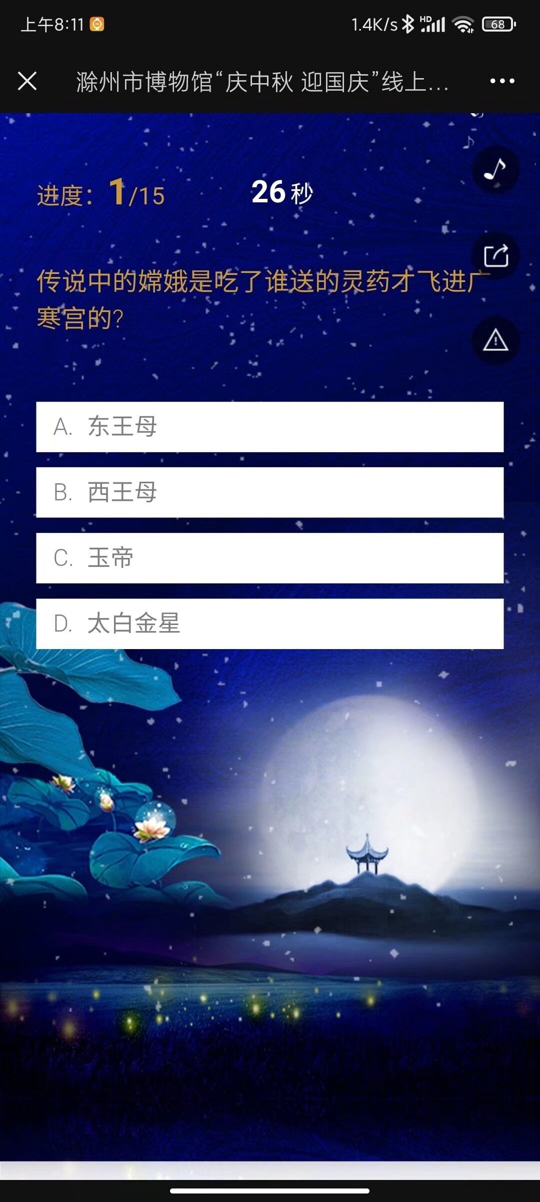 中秋节是我国的传统佳节。根据史籍的记载,“中秋”一词最早出现在《周礼》一书中。到魏晋时,有“谕尚书镇牛淆,中秋夕与左右微服泛江”的记载。直到唐朝初年,中秋节才成为固定的节日。中秋是一个想象优美的神话,一千年一万年脉脉相传,月光融融,在八月十五这天最美。月,洒一地的清辉,思乡的游子,或歌亦吟。中秋之夜,他们的思想是歌海漫天的精灵。因此为了让同学们感受到中秋的热闹气氛和文化,管理学院举办线上答题活动,活动期间每人每天可答题一次,共计15道题。每次答题后对应本次答题分数,取单次最佳成绩为最终分数,排出名次并颁发礼品,同学们参加踊跃。