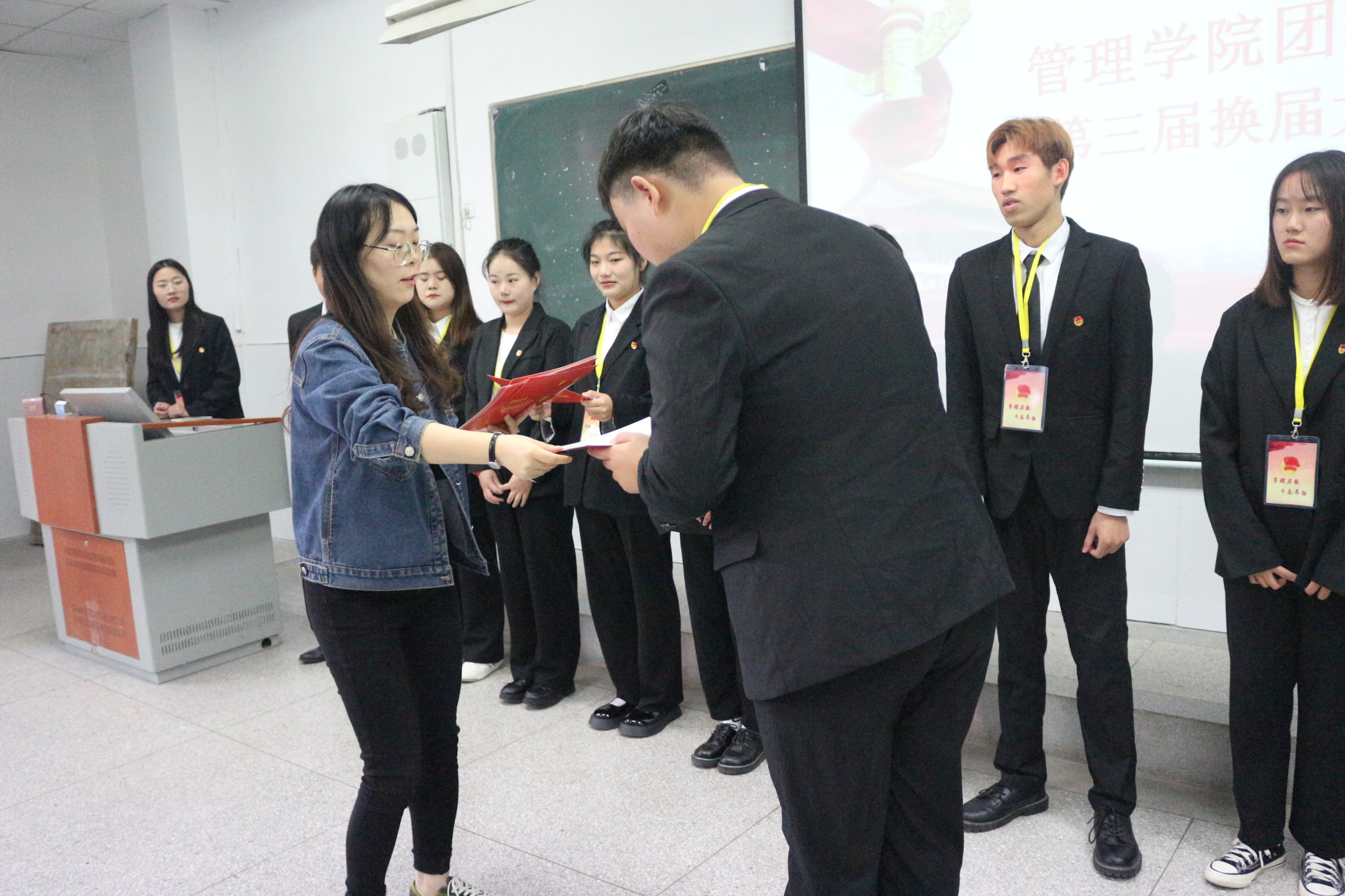 换届大会在国歌声中开启。新一届副书记和各部门部长依次发表就职演说,纷纷表述了对本部门以后工作的打算、对自己的要求和建设、发展好本部门的信心。随后,管理学院第二届团总支副书记胡春晓发表述职报告,包含了对过去团总支工作的回顾,以及对下一届团总支干事的期望。