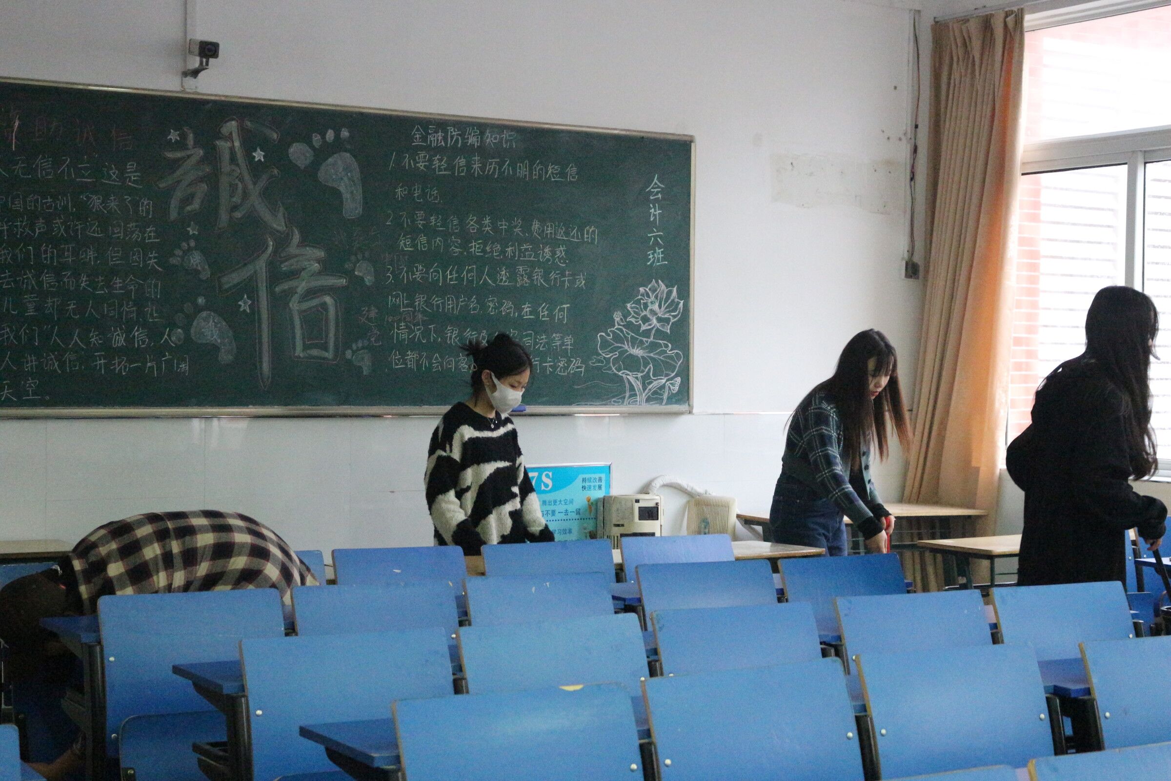 管理学院众人共同打扫教室卫生,同学们携带打扫用具前往教室打扫,一些同学负责将地面垃圾清扫干净,一些同学负责打扫黑板、清理讲台、擦拭门窗。此次打扫工作同学们认真细致,将每一处卫生死角都进行了彻底的清理。在清扫过后,由学院文明督察员检查。打扫卫生结束后,大家将工具一一归还并有序摆放。
