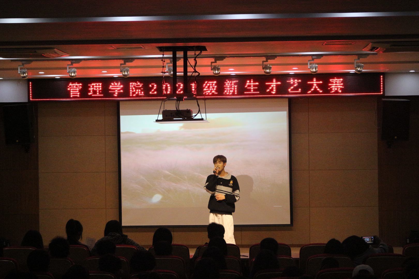 本次大赛,由管理学院学生会主席王梦缘,副主席孔珺禾、殷茂源,学生会文娱部部长王宇航以及管理学院大学生艺术团团长朱巧巧担任评委,并特别邀请了管理学院团总支负责人袁一老师及2020年十大歌手比赛季军程桂明学长一同观看比赛。节目精彩纷呈,有歌唱类、舞蹈类、朗诵类及书画类,赢得了同学们的阵阵掌声和欢呼声。在所有节目结束后,朱巧巧学姐与程桂明学长先后演唱了歌曲《最初的梦想》和《水星记》,把比赛的气氛推向了高潮。