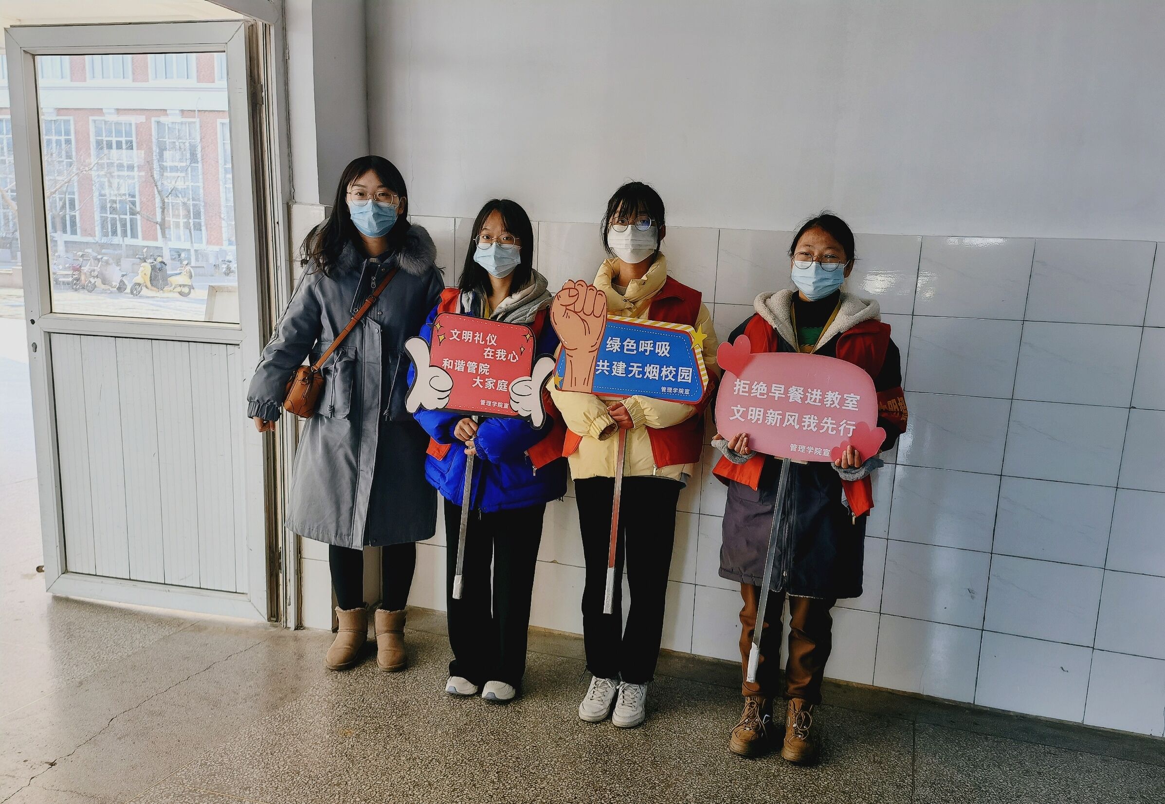 督察员们手拿劝诫标语,针对带早餐进教室、抽烟、身着奇装异服等不文明行为进行劝导。在寒风中,督察员们构成了一道亮丽的风景线。