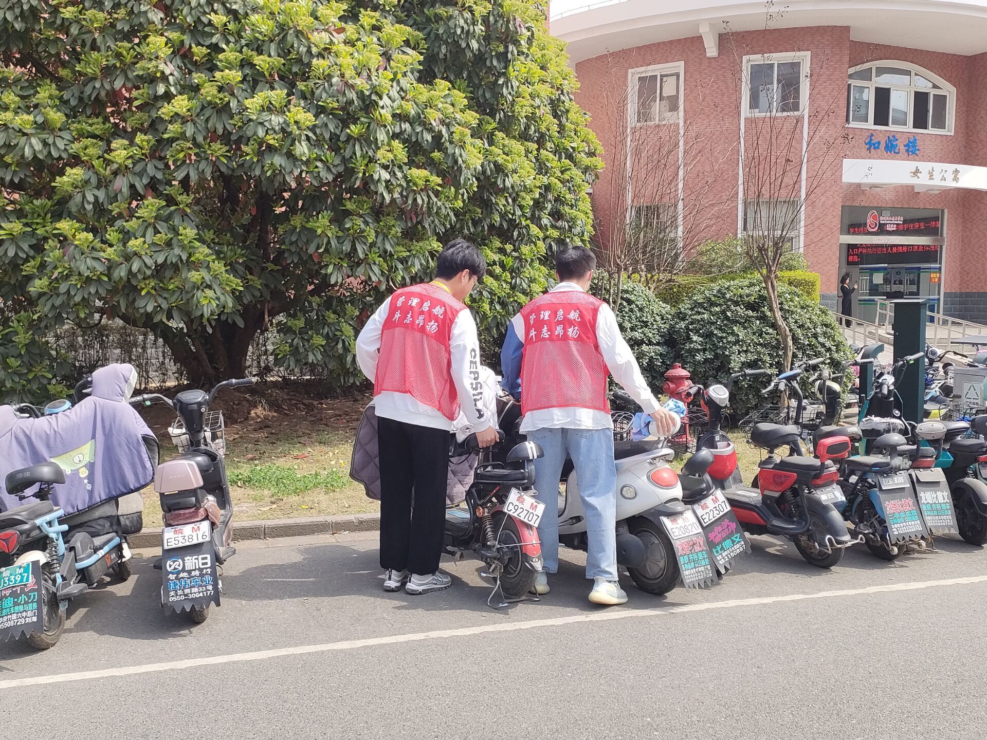 团总支的青年们头顶烈日,身着志愿者服装,在学校和食堂门口把未在指定区域内停放的电动车,按照要求摆放整齐,并对相关同学开展宣传教育。