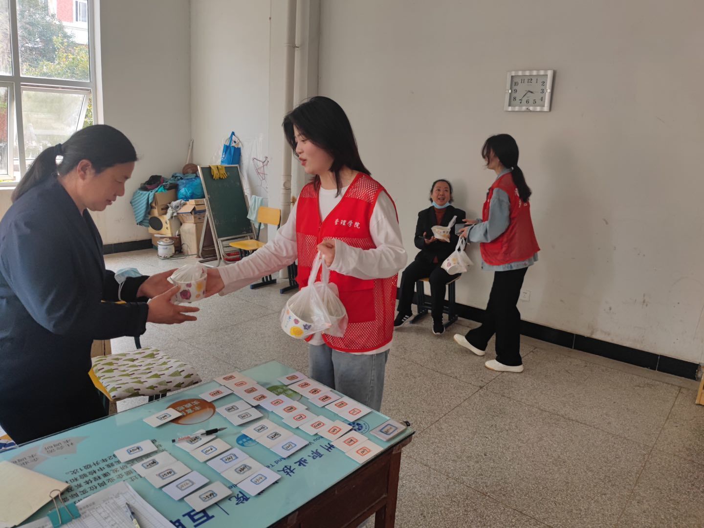 我们在食堂提前准备好了食材和工具,大家在欢声笑语中不知不觉地包完了一千五百个饺子。随后,同学们来到后厨,把饺子下入锅中,没一会儿,热气腾腾的饺子就出锅啦。接着,大家把饺子打包好,送给学校的保安叔叔、宿管阿姨、环卫工人等等,他们纷纷为管理学院点赞。