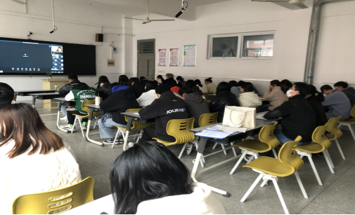 在致真楼1319教室,管理学院院长翁嘉晨,副院长颜洲现场聆听李贝贝老师的授课,辅导员到岗维持秩序,同学们认真收看老师视频直播教学,跟随老师的思路进行学习。