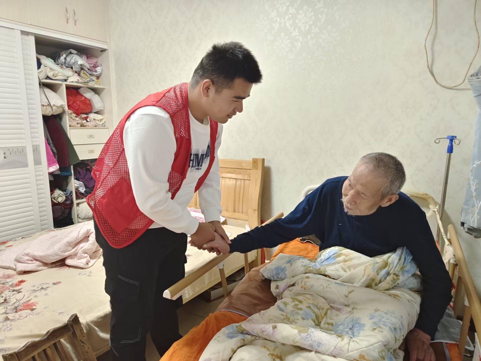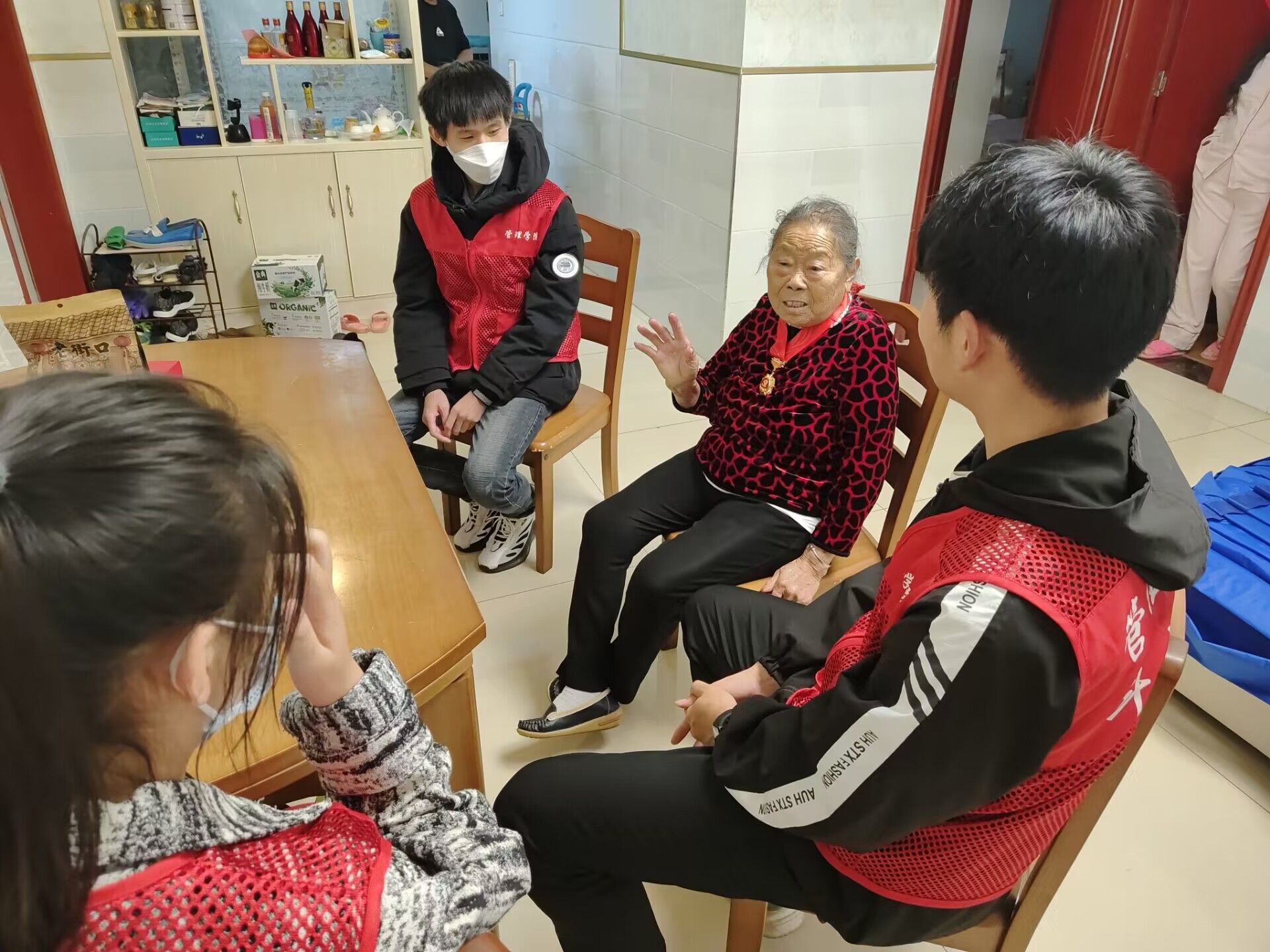 10月4日下午14:00,管理学院学生会成员在学校东门集合,大二干事带领其他成员一同前往老党员家中。下午15:00到达老党员侯奶奶家中,侯奶奶在1959年加入中国共产党,迄今已有63年党龄了。志愿者们给侯奶奶送去了牛奶和营养品,侯奶奶看到大学生们来看望她,开心的合不拢嘴。侯奶奶和志愿者聊了刚参加工作时的困难和特殊时期生活的艰辛,告诉志愿者们现在美好生活的来之不易。志愿者还去屋里看望了侯奶奶的老伴王爷爷,王爷爷在2010年脑血栓发作摔倒在地,之后就一直卧床无法下地正常走路和说话,甚至连最基本的大小便都无法自理。是侯奶奶自己照顾老伴照顾了十几年,十分不易。志愿者们进去握着爷爷的手和爷爷说了会话,虽然爷爷无法说话,但是能感受到对我们的到来而感到高兴。