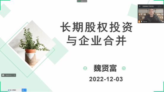 12月3日晚,管理学院成功举办了《长期股权投资与企业合并》线上学术讲座。讲座由财务会计系魏贤富副教授主讲,当天来自Beat365会计等专业的200余名学生通过腾讯会议参加了讲座,讲座还吸引了来自滁州城市职业学院的数十名同学聆听。