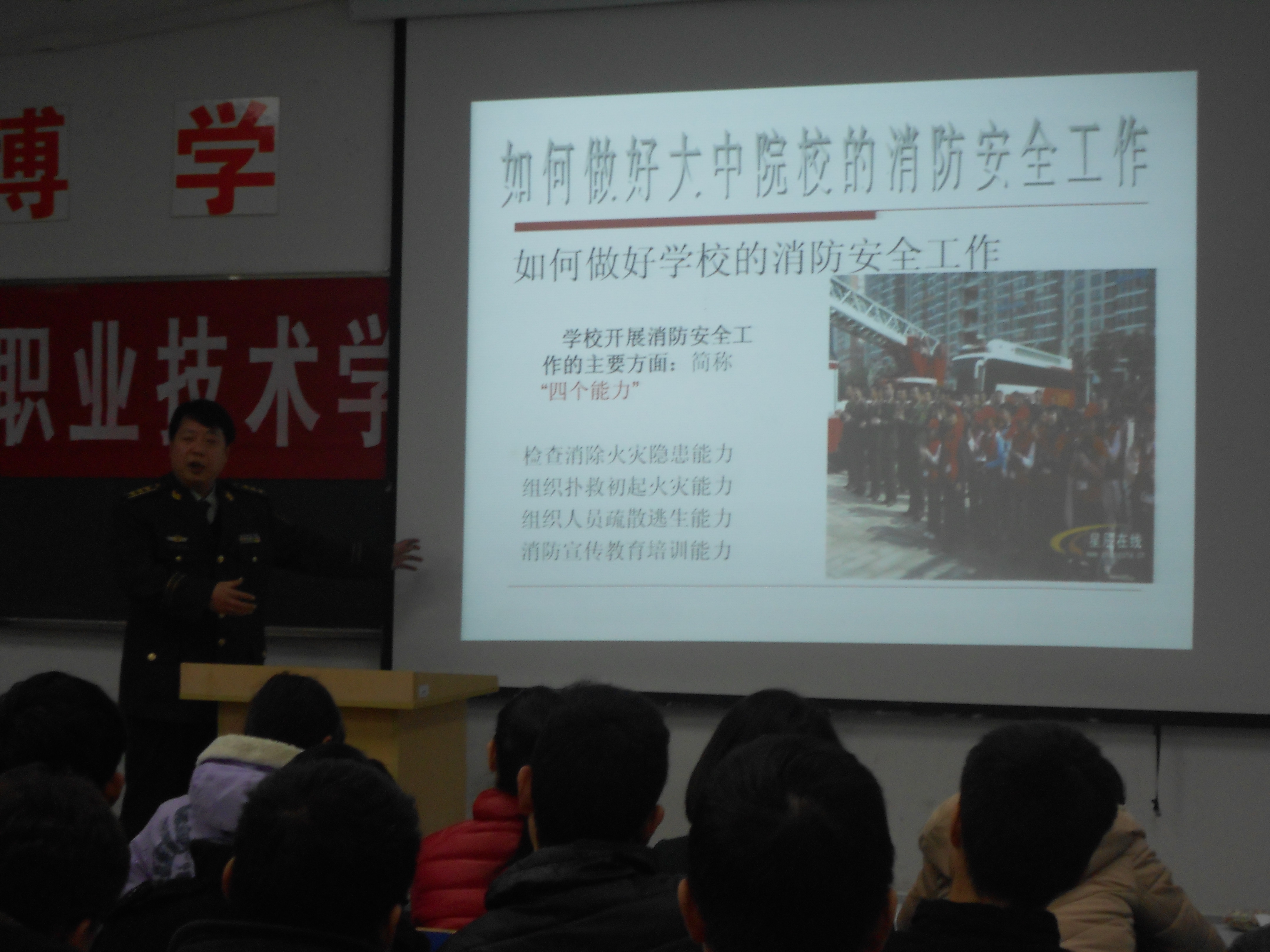 为切实做好消防安全工作,共建平安校园,2014年12月24日下午2:50,一场有关消防安全知识的讲座在5102教师开讲,本次讲座特邀滁州市消防支队宋处长做主讲。机电系学生认真聆听了本次讲座。