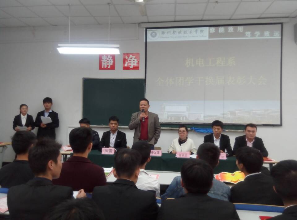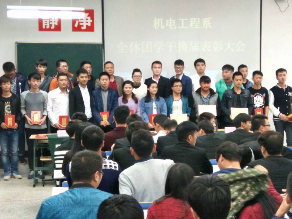 2015年10月28日中午12:00,机电系在北阶102教室举行了2015-2016学年学生干部换届大会。机电系党总支书记晋太洋,团总支负责人谢丽丽以及机电系团总支学生会、社团、各班团支部全体学生干部参加了本次会议。