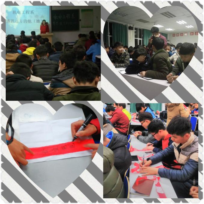 老子说:知足者富,知恩、感恩、谢恩才会懂得知足。为了让同学们学会感恩,学会珍惜,学会理解和宽容。2015年11月26日,机电工程系团总之在5103开展了以感恩远方的他(她))为主题的活动。机电系团总支所有成员、志愿者都参加了此次会议。