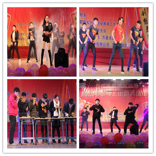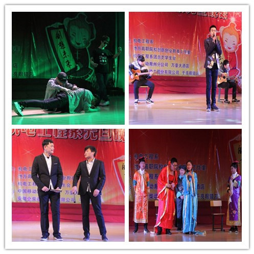 本次晚会分为“敢于有梦”、“勇于追梦”、“共创辉煌”三个篇章,整场晚会精彩纷呈,高潮迭起。机电六班带来《说好的幸福呢》,文娱部带来的《约定的永远》、《回忆里的那个人》;光伏班带来幽默诙谐的舞蹈《菠萝菠萝蜜》、生活部带来的舞蹈《青春爱最大》、文娱部带来的舞蹈《Watch me》、《You are the one》、更有街舞社带来的舞蹈《千年等一回》引爆全场;学习部带来的相声《童年》;而一场晚会大家印象深便是语言类节目,机电系的小品也是每场都能戳中观众的笑点,比如:纪检部带来的小品《副导演》、体育部带来的《甄嬛后传》、电气二班《校园选秀》。而中场穿插的有趣小游戏场面也是很火爆,礼品极其丰厚。