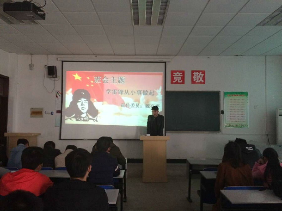 为使全班同学深刻领会雷锋精神的真实内涵,时刻用雷锋精神指引着我们学习和工作的前进方向,此次活动主要分为以下几部分: 一、雷锋事迹介绍:付天阳用ppt和视频介绍了雷锋同志的生平和他日常生活中事迹,视频中的一些看似微不足道,实际上却深入人心、感人至深的事情,深深的教育着我们。“人民的勤务员”“孩子们的知心人”“模范班长”一个个亲切的称呼道出了广大人民对雷锋同志的感激和热爱。 面对国家和人民授予他的荣耀,他总是抱着谦虚谨慎的态度。结合我们要外出就业的现实,学习雷锋同志伟大的人格魅力,使我们以后不管是在生活中还是在工作中,认识到于人方便就是于己方便,帮别人就是帮自己。 二、雷锋事迹介绍:通过各班委的演讲,让同学们从真实的故事中获得启发,并以此来激发自己的上进心;另外借此机会表扬了班级先进个人。三、班长柏成建总结活动:旨在贯彻落实雷锋精神,大力弘扬雷锋服务人民、助人为乐的奉献精神;大力弘扬雷锋干一行爱一行、专一行精一行的敬业精神;大力弘扬雷锋锐意进取、自强不息的创新精神;大力弘扬雷锋艰苦奋斗、勤俭节约的创业精神。