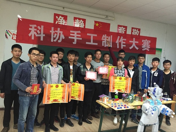 首先由协会会长周围为本次大赛致开幕词,他希望这项特色活动能够继往开来,成为全院学生展示“心灵手巧,爱家环保”的舞台;随后,参赛选手争分夺秒,对作品进行最后的调整,并向大家进行了作品介绍。这些作品的原料都选自废弃材料,如:废纸盒,废瓶子,废易拉罐等,然后用自己的巧手和智慧将这些即将被遗弃的废旧物品幻化成精巧的工艺品,从而焕发出全新的光彩来点亮生活,筑梦生活。会长周围同学从“艺术品”的“创意”“美观”“实用”和“环保”四个方面进行了综合考量和评判。最后,由曹飞同学制作的电动小式吸尘器夺得了此次比赛的冠军、余涛同学的塑料瓶机器人获得了亚军、王子印同学的易拉罐小型飞机获得了季军,会长周围并予以颁奖。最后由参赛选手和工作人员一起合影留念。