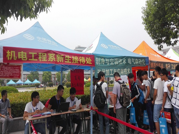为确保新生顺利办理各项手续,我系采取一站式服务,新生报到确认、缴费情况确认和住宿通知单领取,简化了入学手续,为广大新生报到带来了极大的便利。同时还专设了休息处和饮水处,安排志愿者为新生及家长服务,帮助新生们完成注册,领取生活物品,以及入住宿舍等工作。报到点前设立了2块展板,向新生介绍机电系的基本情况,专业设置,学术发展等信息,让大一新生们在入学的第一天就深深感受到机电系的魅力所在。此次迎新工作持续了两天。各级学生干部及志愿者积极投入到迎新工作中,各司其职,各尽其力,积极为迎新工作的顺利开展做贡献。