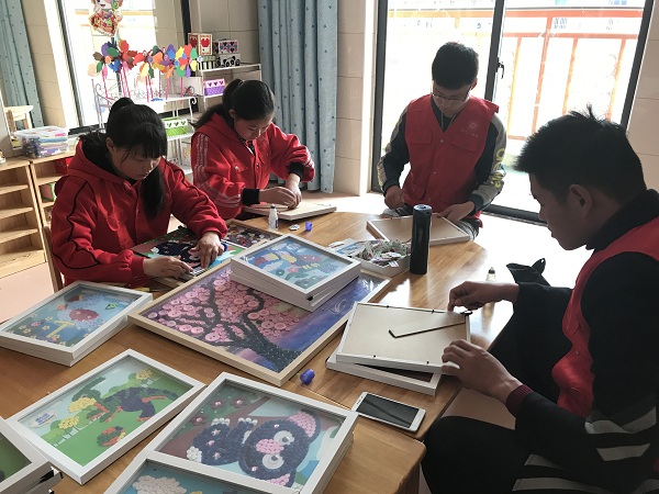 志愿者们为福利院的孩子准备了零食和玩具,但由于孩子的特殊情况,没能与孩子进行交流。随后在福利院工作人员的安排下将志愿者分成三组:一组的志愿者在“快乐厨房”里帮助清理房间;二组的志愿者在“特教班”里完成小朋友们做的手工纽扣画;三组的志愿者来到食堂进行包饺子。虽然志愿者们这次没有与孩子们接触,但是默默地服务是为了孩子们更好的成长,希望这些“折翼的天使”能够重新“遨游天空”。