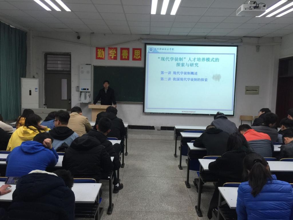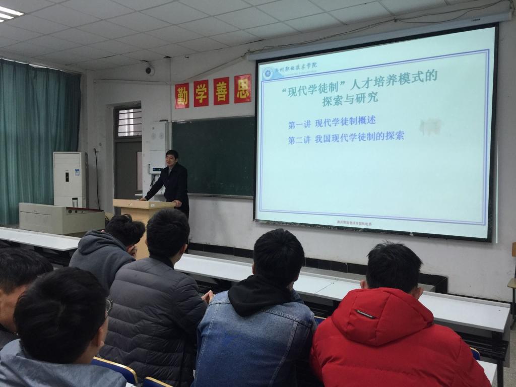 2019年3月13日,机电系杨思国主任在5102多媒体教室举办学术讲座。讲座的题目是:“现代学徒制”人才培养模式的探索与研究。讲座从现代学徒制概述、我国现代学徒制的探索、我院“现代学徒制”试点工作三个方面,阐述 “现代学徒制”的起源和发展过程,分析和总结我国现代学徒制”试点工作取得的经验,提出制约我院“现代学徒制”试点工作的因素及实现路径。学院部分教师、机电专业部分学生及17博西华班全体学员听取了报告。