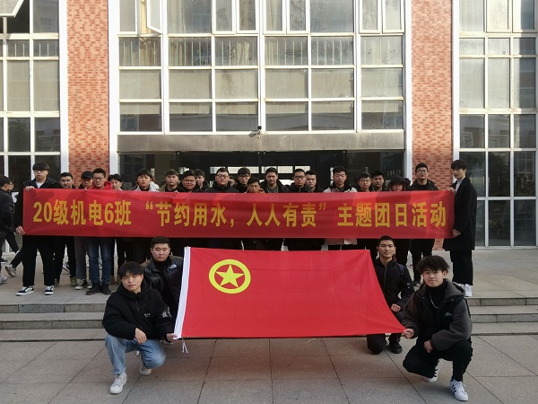 20机电6班团支部开展“节约用水,人人有责”主题团日活动。支部成员在校园内向同学们倡导“节约用水,低碳减排,绿色生活”的理念,作为新时代大学生,更应该以身作则,从小事做起,从现在做起,树立节约意识。