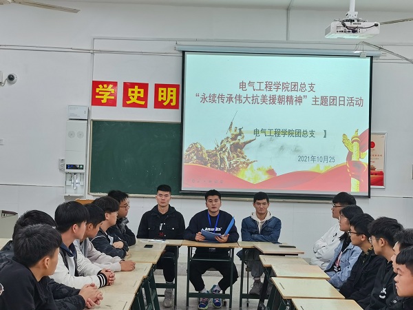 为纪念抗美援朝战争胜利71周年,引导广大团学青年弘扬爱国主义精神,10月24日晚,电气工程学院团总支在致新楼5504教室开展“永续传承伟大抗美援朝精神”主题团日活动。我院团总支副书记毛杰主持本次活动,21级各班班长、团支书参加。