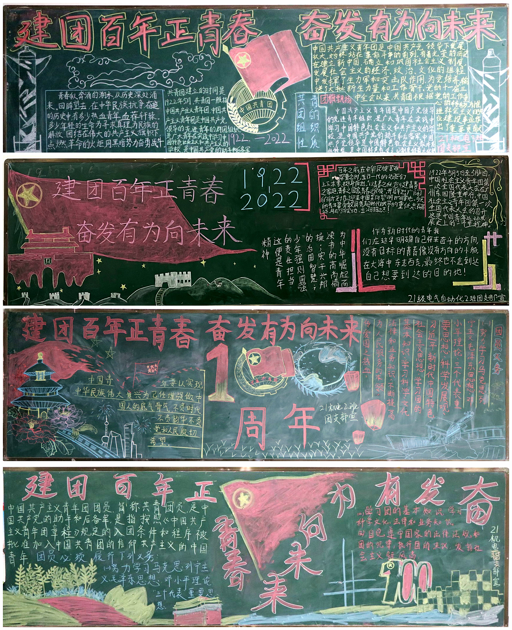 为庆祝中国共青团建团100周年,引领团学青年自觉坚定听党话、跟党走的青春步伐,赓续百年薪火,勇担青春使命,电气工程学院团总支充分利用宣传阵地,以海报、黑板报的形式进行庆祝“建团百年”主题宣传。