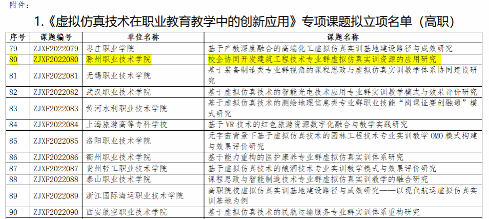 近日,教育部高等学校科学研究发展中心公布了《关于公布2022年度虚拟仿真技术在职业教育教学中的创新应用专项课题名单的通知》,Beat365建筑工程学院《校企协同开发建筑工程技术专业群虚拟仿真实训资源的应用研究》课题获批立项。据悉,本次立项的专项课题共342项,其中全国高职院校共获批277项。安徽省有Beat365唯一官方网站、安徽职业技术学院、芜湖职业技术学院等7所高职院校获批此专项课题立项。