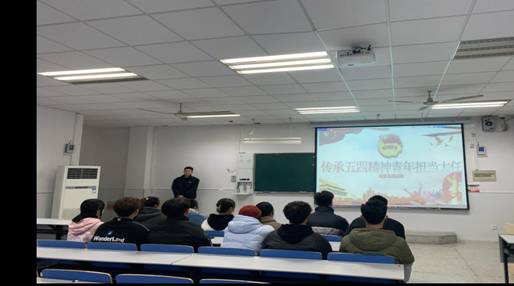 会议开始,戴文强向各位入团积极分子讲解五四运动的发展历程。让同学们观看五四运动相关的影片,使在座的同学们能够更深入的了解到五四运动的精神核心,激发同学们热爱祖国,积极创新,科学探索的爱国主义精神,以及弘扬爱国,进步,民主,科学的五四精神。同时,戴文强还呼吁同学们要铭记历史与先辈们的伟大,传承爱国主义精神,担当时代大任。