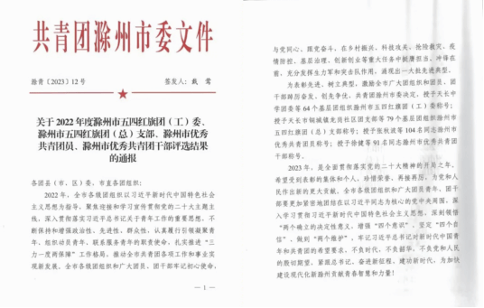 近日,共青团滁州市委公布了2022年度滁州市五四红旗团(工)委、滁州市五四红旗团(总)支部、滁州市优秀共青团员、滁州市优秀共青团干部评选结果,我院20市场营销2班团支部荣获“滁州市五四红旗团支部”荣誉称号。