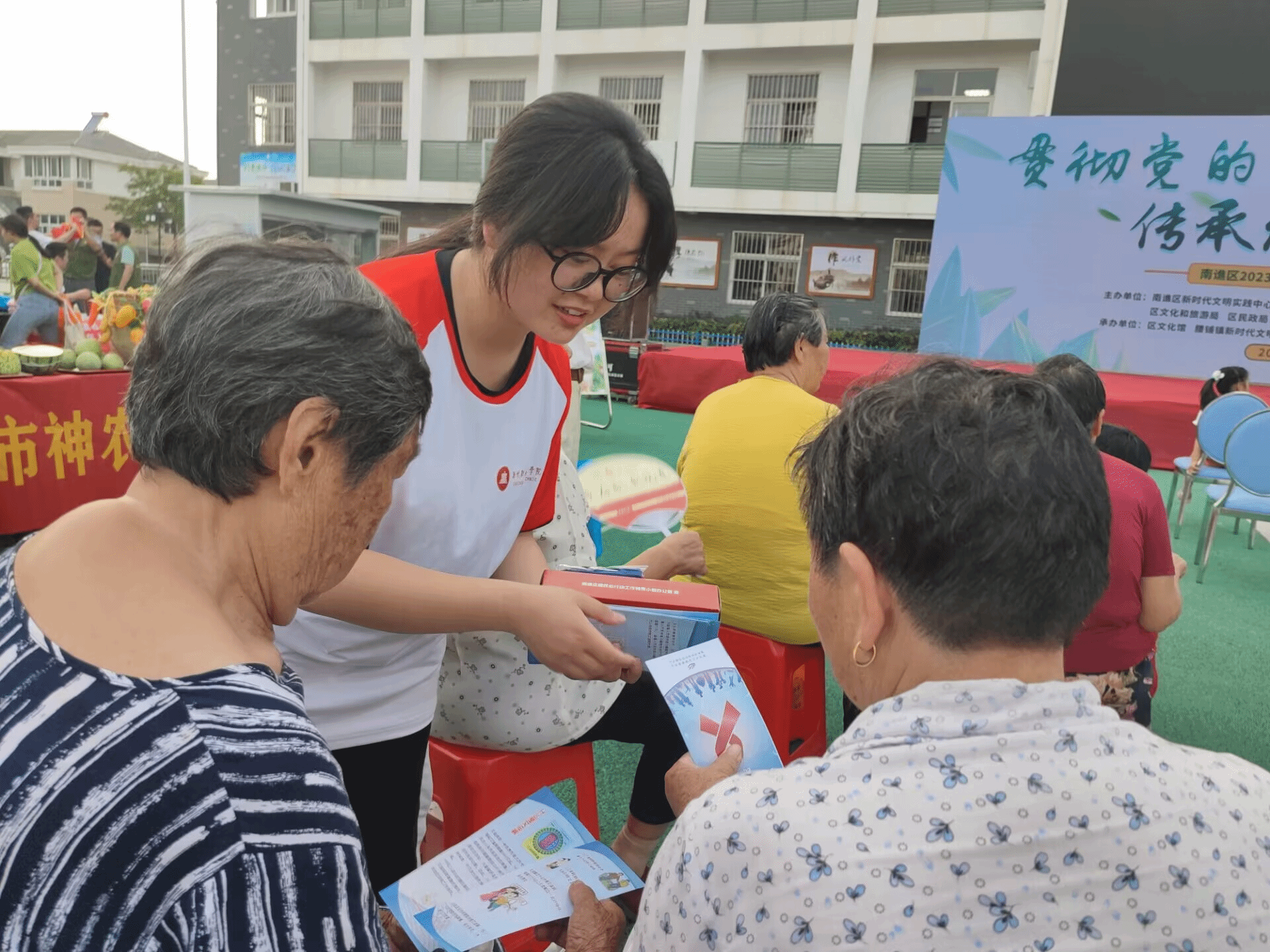 活动开始时,实践团成员通过摆放展板、发放宣传、送抽纸、展示艾滋病发病之后的图片、案例、宣传海报等方式,向村民们介绍艾滋病的病因、危害以及如何进行防治等方面的知识,让村民们知道养成良好的健康生活习惯的重要性。